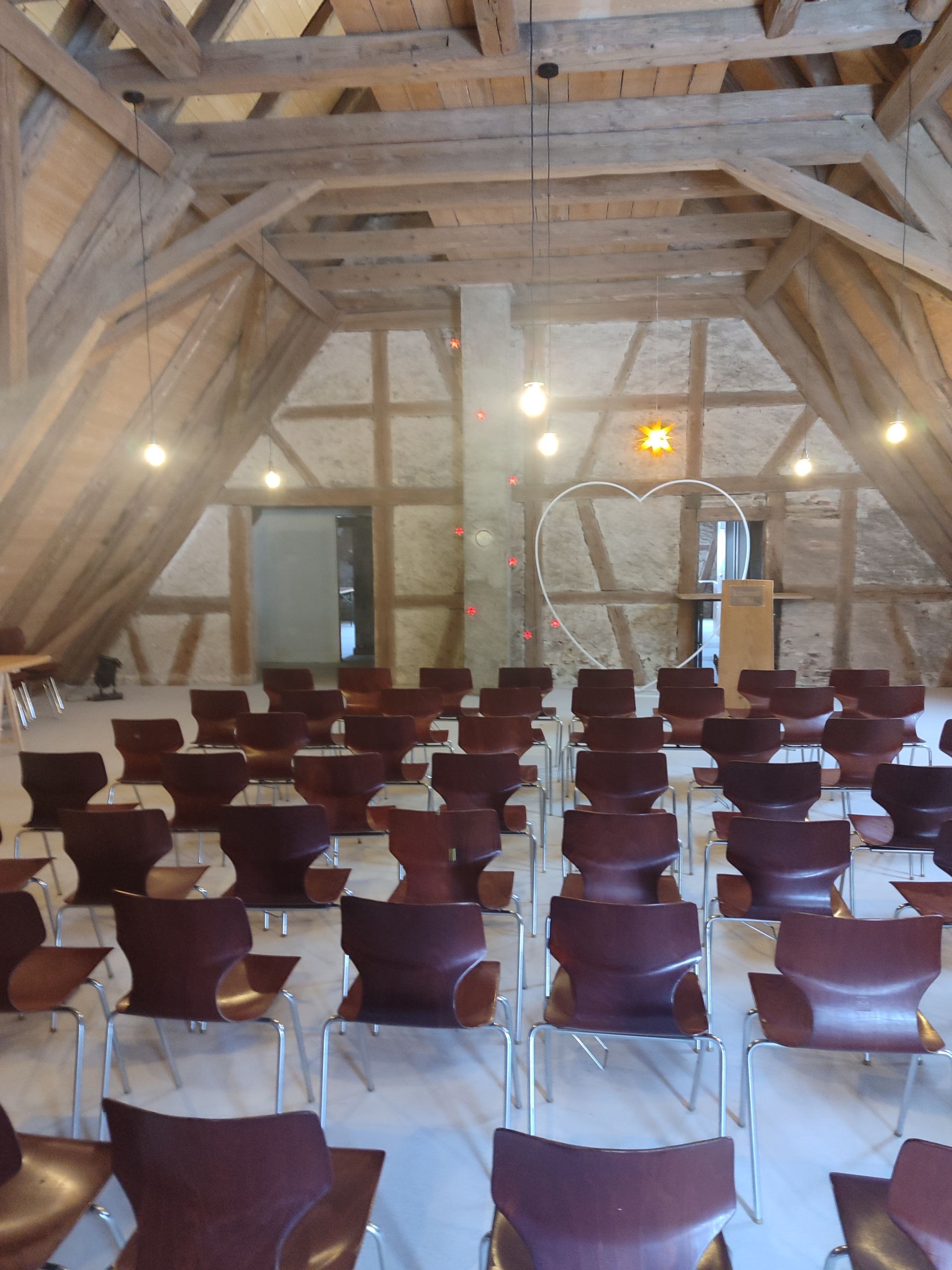 Platz für 80 Personen bei Bankettbestuhlung (z. B. Hochzeiten) bis zu 100 Personen bei Reihenbestuhlung (Vorträge, Konzerte)