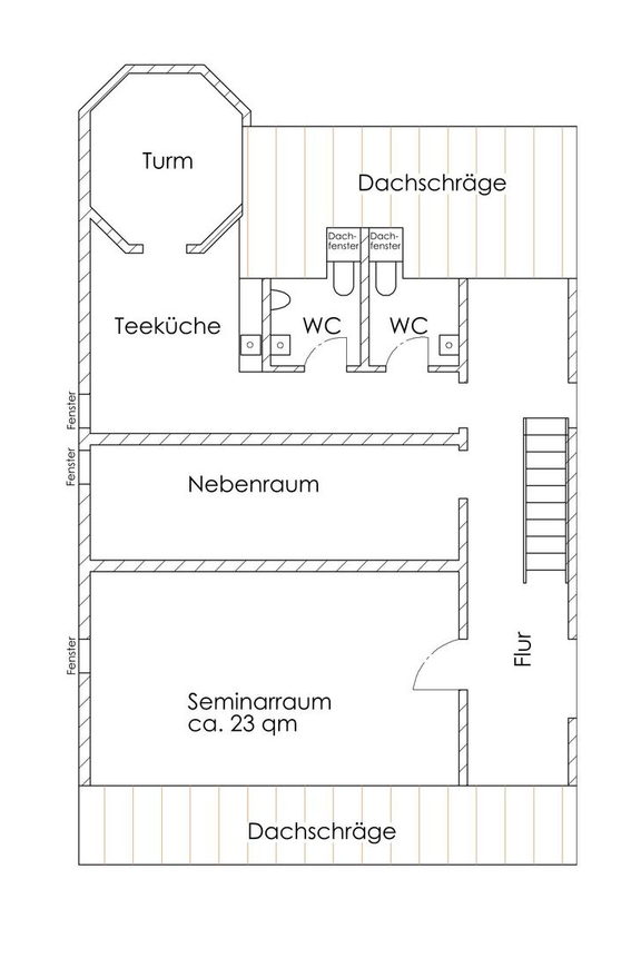 Der imposante Dachraum ist der größte Raum. Gleich einer Kathedrale lässt er die ursprüngliche statische Konstruktion erkennen, stützenfrei und geprägt durch die mächtige Holzkonstruktion. Auch die Wände wurden soweit möglich im ursprünglichen Zustand belassen.